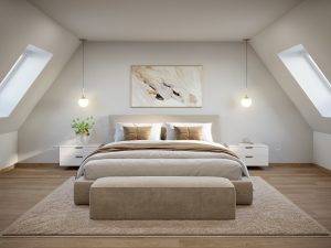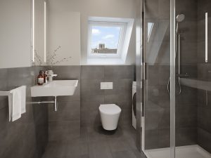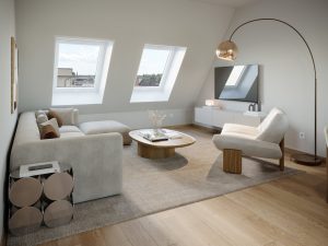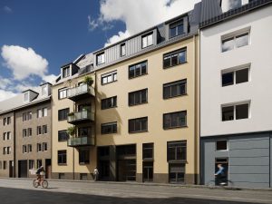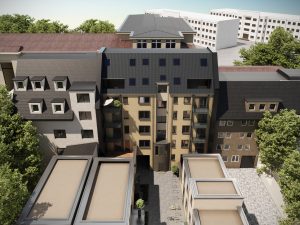 Im Rahmen der umfangreichen Sanierungs- und Modernisierungsmaßnahmen wurde die vorhandene Dachgeschossebene entfernt und ein Satteldach – nach neuesten energetischen Standards – über drei Ebenen mit sechs neuen Wohneinheiten, davon zwei als Maisonetten, errichtet.